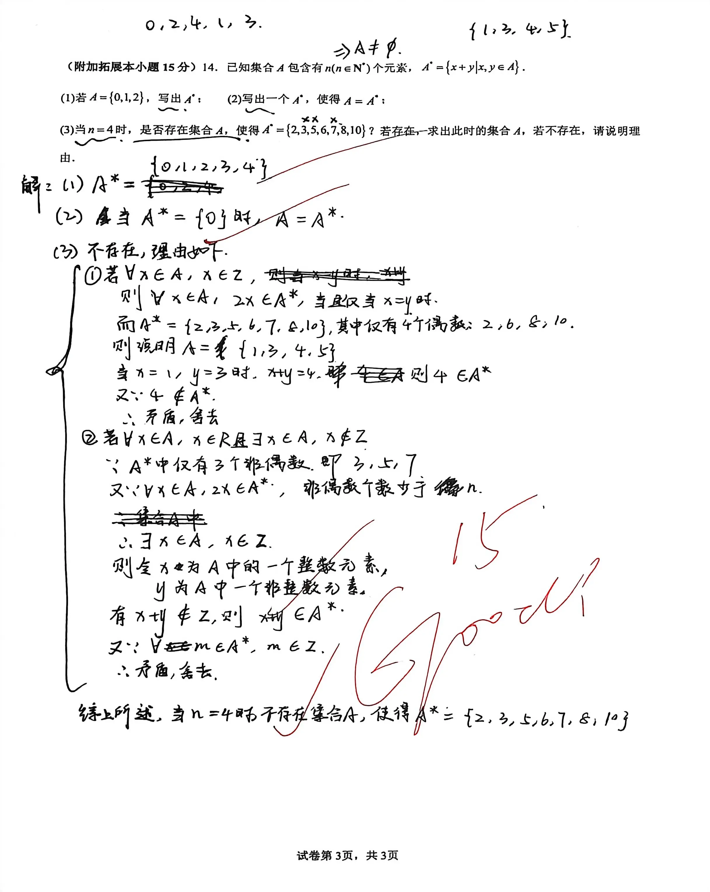 14.已知集合A包含有n(n∈N∗)个元素,A∗={x+y∣x,y∈A}.(1)若A={0,1,2},写出A∗;(2)写出一个A∗,使得A=A∗;(3)当n=4时,是否存在集合A,使得A∗={2,3,5,6,7,8,10}?若存在,请求出此时的集合A;若不存在,请说明理由.