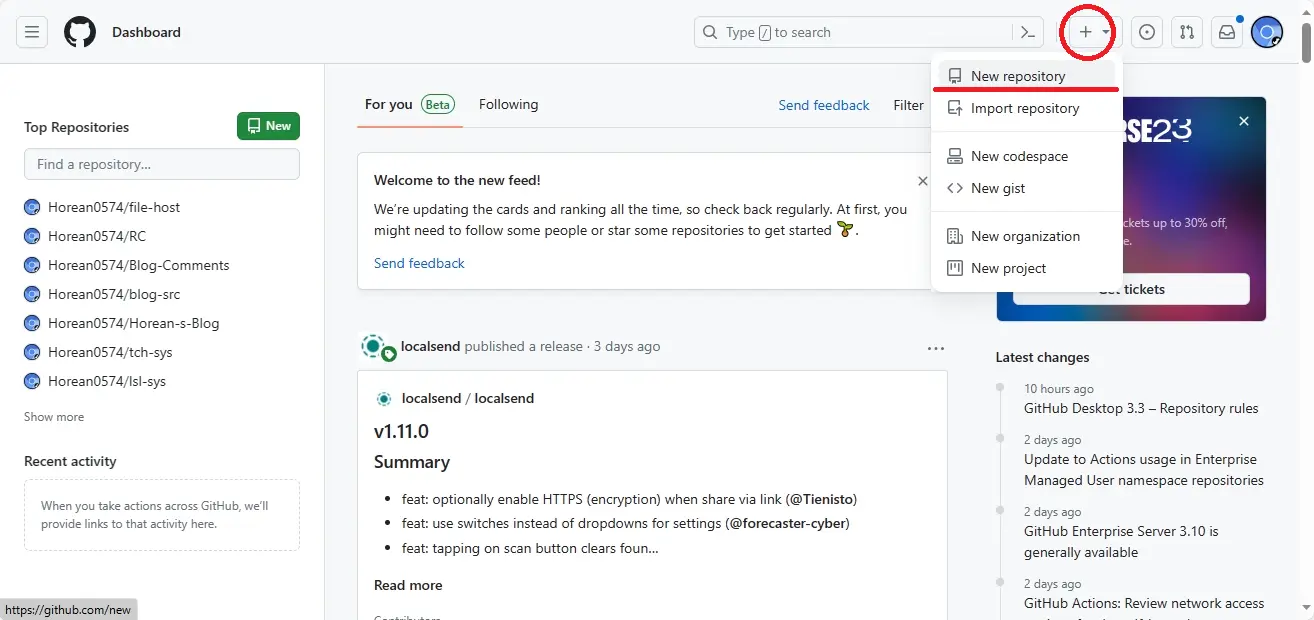 - 我们在 GitHub 控制面板找到右上角的 小加号,再点击