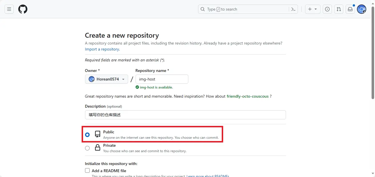 Repository name那里填上img-host(也可以换成其他你喜欢的仓库名称),Description那里填写上你的仓库描述。
