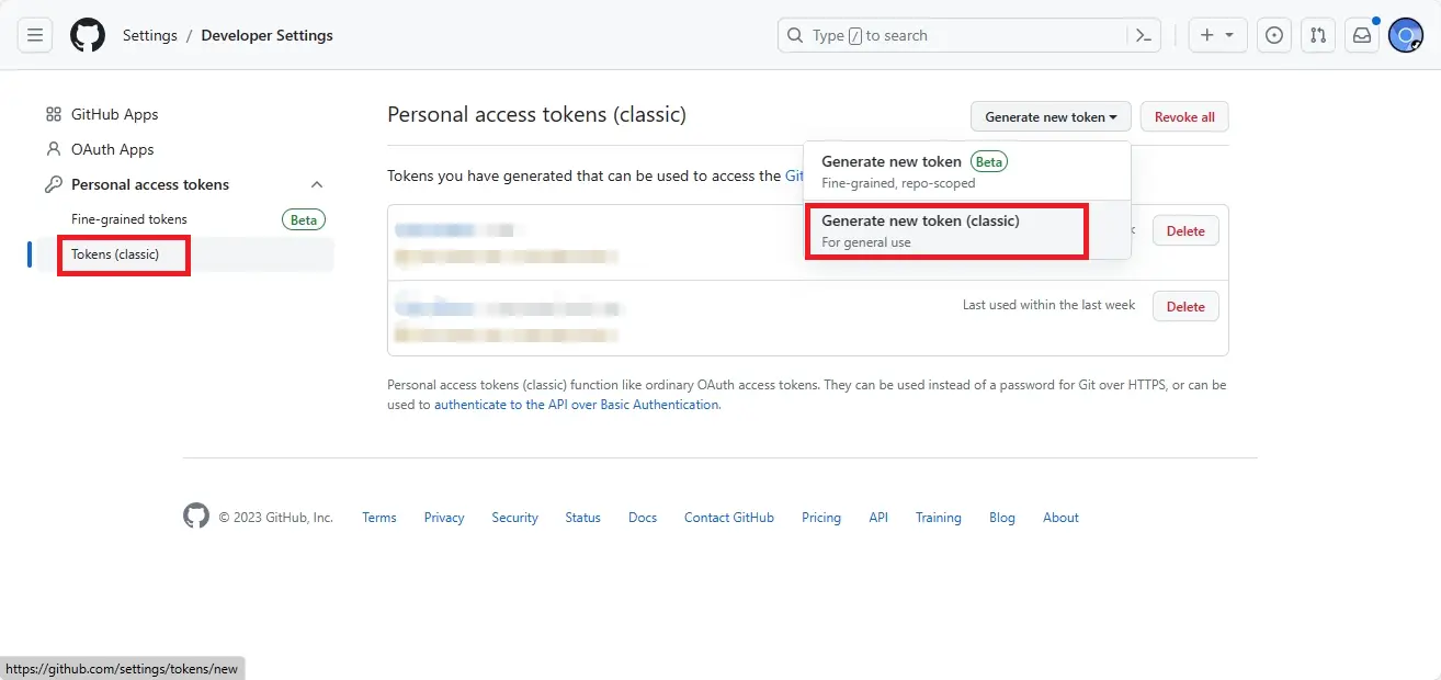 然后在左侧选择 Personal access tokens,再选择 Tokens (classic),进入以后,点击右上角 Generate new token 选择 classic 版生成新的密钥。