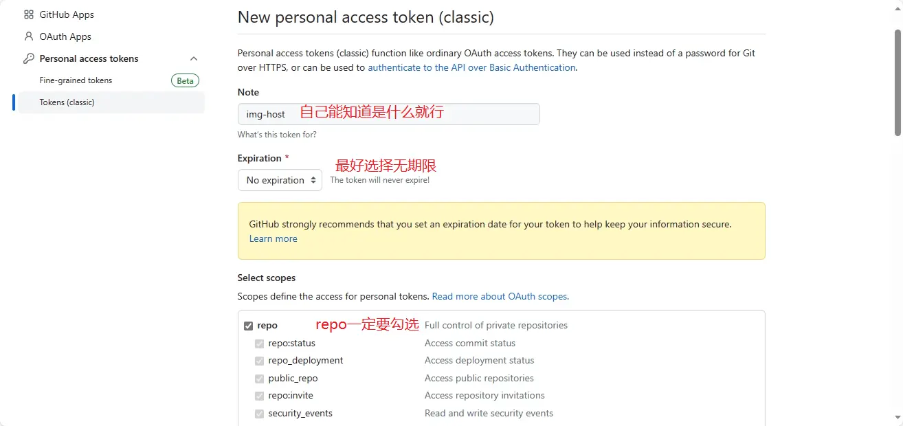 然后 Token 名称自己能知道是什么就行,有效日期作者推荐无期限(No Expiration),不然每次到期还要再新建一个,还要更改配置,然后下面的 Token 权限选择只需要勾选 repo 就可以了,其他权限不需要用到。