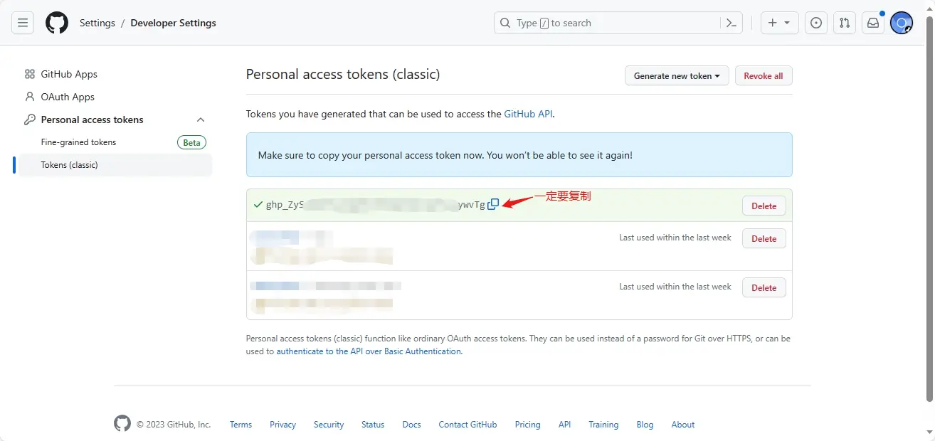 点击 Generate token 生成密钥,然后一定要记得复制生成的密钥,它只会显示一次!